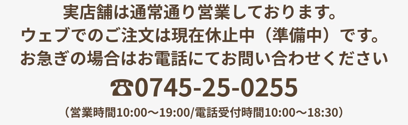実店舗は営業中!ウェブは改装中です。お急ぎの場合はお電話にてお問い合わせください